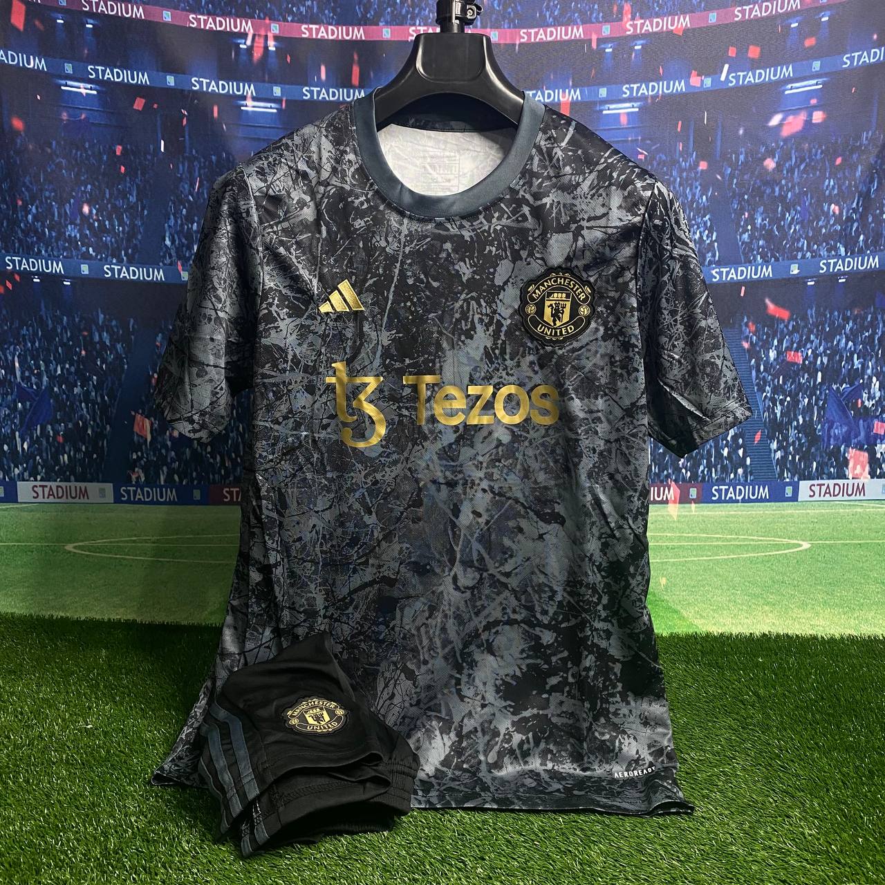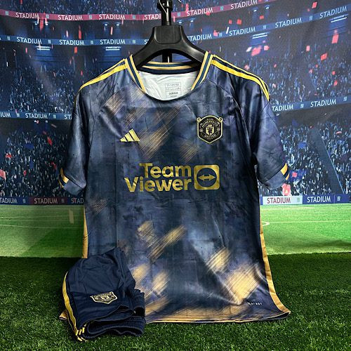 لباس کانسپت منچستر یونایتد 2025 هواداری با شورت سورمه ای طلایی
